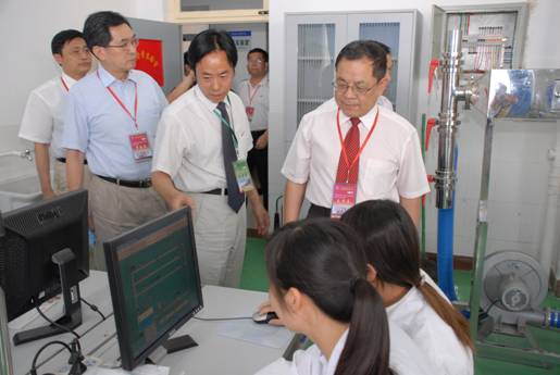 专家考察多媒体教室监控系统室 在外语系语音实验室和音乐系数码钢琴室,外语系主任党明虎教授和音乐系主任刘进锁教授分别向专家们介绍了室内设备和使用情况,音乐系学生现场作了钢琴演示。 随后,专家们在化学化工系观看了化学系宣传片,考察了流体力学实验室、省级重点实验室植物化学实验室、化学热力实验室和博士工作室。专家杨雪特教授询问了表面与胶体实验室的投资情况,专家王蒲教授查阅了实验室的工作日志。在药物化学实验室,专家组副组长王磊教授与正在做实验的学生作了亲切交谈,并就杨得锁博士承担的两个国际合作项目与他交换了意见。在地理科学与环境工程系实验室,专家们听取了地环系主任韩景卫教授对实践教学特色和学科亮点的汇报,重点考察了新建成的天文观测台和灾害监测实验室,并兴致勃勃地进行了实地观测。