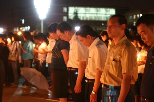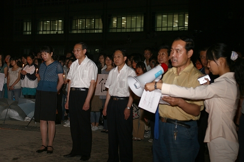 活动于21时40分正式开始,在场的全体师生面向灾区方向默哀3分钟。外语系党总支书记李周让同志讲话,倡议全系师生发扬“一方有难,八方支援”的传统,伸出援助之手,继续向灾区人民奉献爱心。要化悲痛为力量,坚守岗位、恪尽职守,把对灾区人民的关爱之情转化为做好本职工作的强大动力;调整心态,保持镇静,不听信和散布谣言,维护学校正常的教学秩序,认真搞好自身的学习。