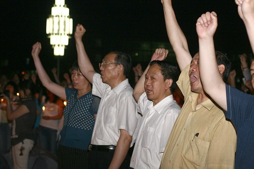 悼念活动在师生振臂高喊“汶川挺住,中国加油!汶川挺住,中国加油!”的口号声中结束。(外语系供稿)