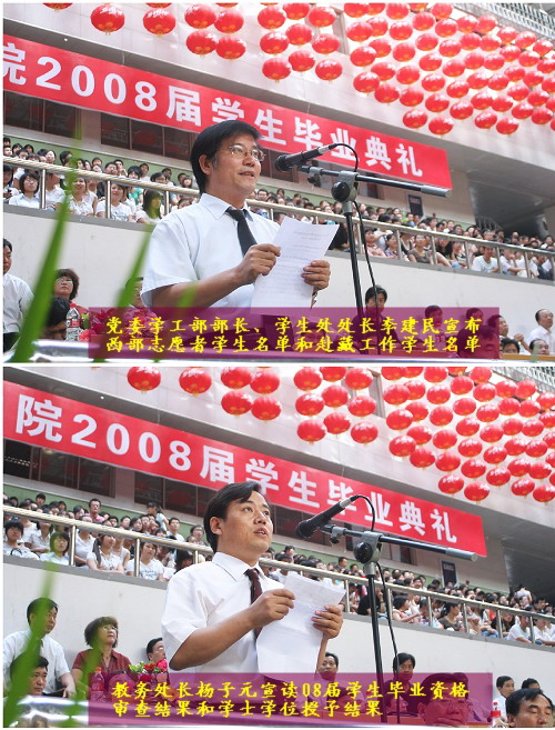 毕业典礼在雄壮的国歌声中正式开始。院党委书记赵怀礼给西部志愿者学生和赴藏工作学生颁发了奖金;学位委员会主席、院长王志刚博士向毕业生代表颁发了毕业证书和学位证书;院党委副书记米晓东宣读了获优秀毕业论文、毕业设计、毕业创作名单;教务处长杨子元宣读了2008届学生毕业资格审查结果和学士学位授予结果;学生处处长李建民宣布西部志愿者学生名单和赴藏工作学生名单。