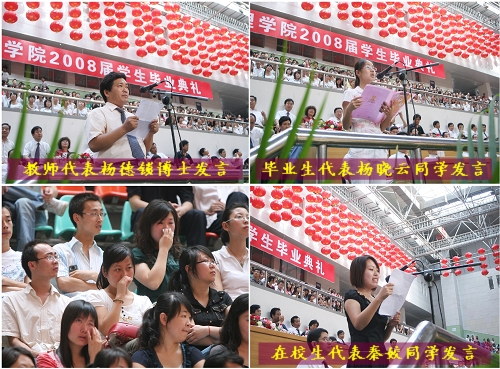 化学化工系杨德锁博士代表全体教师对毕业生圆满完成大学学业表示热烈祝贺。地理科学与环境工程系2004级环境工程专业毕业生杨晓芸代表全体毕业生向辛勤工作、勤于奉献的老师们表示衷心的感谢,在今后工作岗位上发扬文理精神,牢记“博文、明理、厚德、尚能”的校训,为母校增光添彩。政法系2006级思想政治教育专业学生秦娇代表全体在校生衷心祝愿2008届毕业生事业有成,前程似锦。