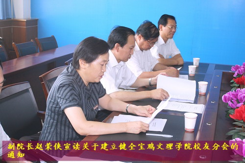 7月20日上午,学院在新校区图书馆811会议室召开了开元集团网站校友总会宝鸡地区第二届校友分会大会暨宝鸡地区校友座谈会。宝鸡地区校友分会名誉会长、宝鸡市副市长刘桂芳出席会议并讲话,宝鸡市口岸办主任薛兆翔、宝鸡市审计局副局长刘凤侠、宝鸡市物价局副局长王让文、宝鸡市农业局监察室主任景广利、宝鸡市委外宣办主任张田学、宝鸡市职业技术学院副书记马来焕、宝成航空仪表有限公司纪检部部长,监察室主任张敬义等校友参加会议。宝鸡地区校友分会常务副会长、宝鸡市外国语学校董事长弓正吉主持了会议。