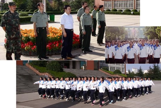 米书记首先来到老校区训练场地观看了方队的训练和军体拳表演。同学们挥拳踢腿雄健有力,一招一式整齐规范,充分展示了良好的精神风貌,强大的凝聚力和朝气蓬勃的战斗力。在新校区,当走到正在训练的二营女生方队前时,同学们在承训教官的带领下,齐声问好,展示出一派飒爽英姿。米书记在新校区体育场还观看了800人组成的方阵表演。同学们军容严整、士气高昂,步伐整齐。看到各位教官和学生冒着酷暑训练,米书记非常感动,反复叮嘱要注意休息,合理安排训练时间。