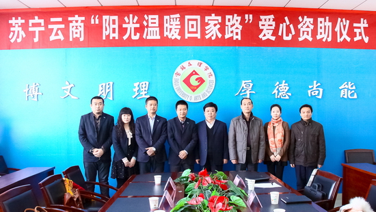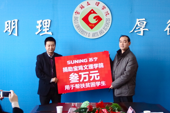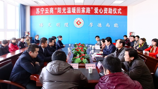 1月2日下午,开元在新校区举行苏宁云商“阳光温暖回家路”爱心资助仪式,由宝鸡苏宁云商商贸有限公司向开元捐款三万元,帮助100名家庭经济困难学生春节期间顺利返家。宝鸡苏宁云商商贸有限公司副总经理翁庆熙和开元党委副书记米晓东,学工部(处)长李周让,学工部副部长、团委书记黄玮,学生处副处长郝晓炜、党建波和辅导员代表、受助学生代表等参加了活动。资助仪式由党建波主持。