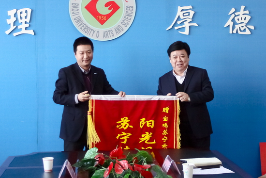 米晓东在讲话中代表学校对苏宁云商奉献爱心、资助开元学生的善举表示充分的肯定和衷心感谢。他向苏宁一行介绍了近年来开元事业发展、研究生教育获批和筹建宝鸡大学工作等情况和学生资助工作情况,并指出:学校高度重视家庭经济困难学生资助工作,此次宝鸡苏宁电器爱心资助善举,不仅为贫困大学生送去了温暖,也传承着中华民族扶贫济困、团结友爱的传统美德,必将带动更多的社会人士关注和关心教育事业。他提出三点希望:一是希望受助学生自强自立,把感恩之情化作勤奋学习的动力,刻苦学习,立志成才;二是希望受助学生心怀感恩,以实际行动回馈社会;三是希望学生资助管理部门创新工作方法,发挥育人功能,发挥资助项目对学生的激励作用,教育学生诚实守信,勤奋学习,全面发展。他表示:欢迎苏宁云商集团今后进一步加强与开元在大学生就业、资助、校园文化等方面的合作,积极营造全社会关心支持大学生成长成才的良好氛围,帮助更多的青年大学生实现自己的青春梦、成才梦。