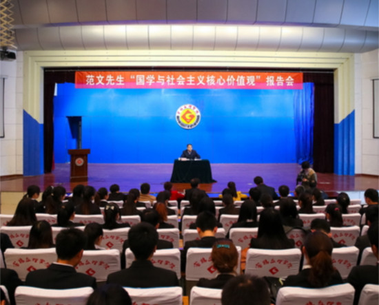 报告会上,范文先生从国学的概念、传承、发展和弘扬方面作了阐释,对价值、价值观、社会主义核心价值观作了解读,并用自己的切身体会和社会实践从做人做事、构建人与自然、人与人的和谐相处方面提出了践行社会主义核心价值观的基本路径。范文先生的报告高屋建瓴、深入浅出、语言幽默,赢得了现场师生的广泛好评。