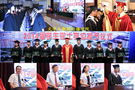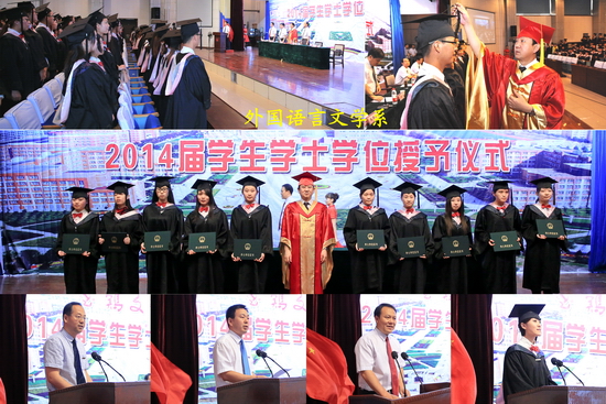学位授予仪式上,各院系院长、主任发表了热情洋溢的致辞。在热烈的掌声和欢快的乐曲声中,毕业生依次上台,校领导分别为全校17个院系的毕业生一一扶正流苏、整帽拨冗,颁发学士学位证书,并与他们合影留念。