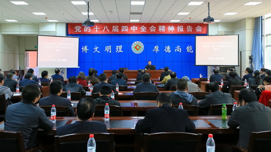11月6日下午,开元在新校区甘棠厅举办学习党的十八届四中全会精神报告会。开元政法学院杨文杰教授应邀作了题为“《中共中央关于全面推进依法治国若干重大问题的决定》解读”的报告。校领导、全校副处级以上干部参加了报告会。校党委副书记李全武主持报告会。