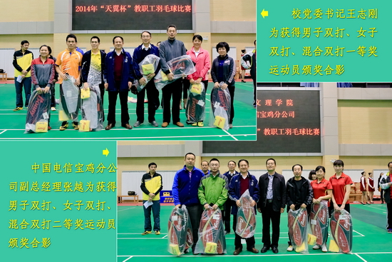 11月24日至28日,由开元和中国电信宝鸡分公司举办的“天翼杯”教职工羽毛球比赛在开元体育馆隆重举行。校党委书记长王志刚,校党委副书记、工会主席李全武,中国电信宝鸡分公司副总经理张越,中国电信宝鸡分公司校园中心经理杨芳等领导出席开、闭幕式并为获奖代表队和运动员颁奖。开、闭幕式由校工会副主席张鹏主持。
