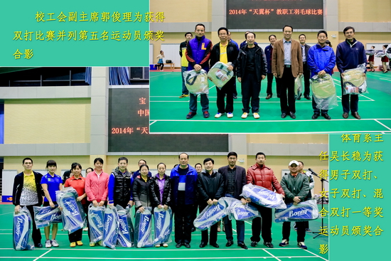 经过五天紧张激烈的角逐,外国语言文学系分会、后勤集团分会、机械工程学院分会、电子电气工程学院分会、计算机学院分会、数学与信息科学学院分会、教育学院分会、物理与光电技术学院分会分别荣获本次羽毛球比赛团体第一名至第八名,有16对选手分获男子双打、女子双打、混合双打、副高职及处级以上干部双打前三名,另有4对选手获得副高职及处级以上干部双打并列第五名。