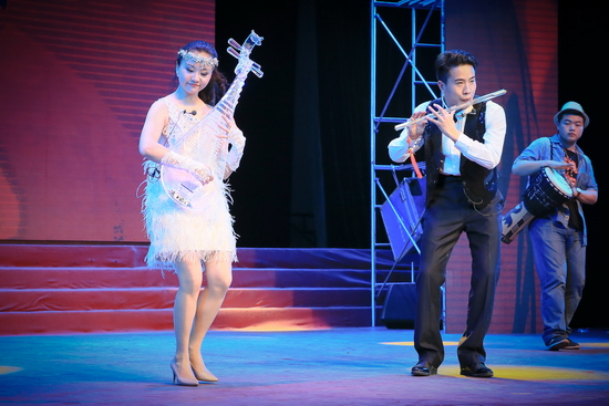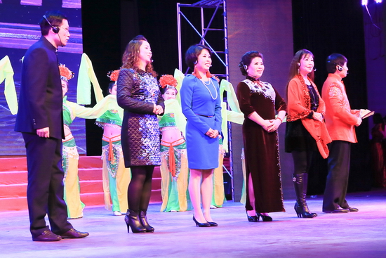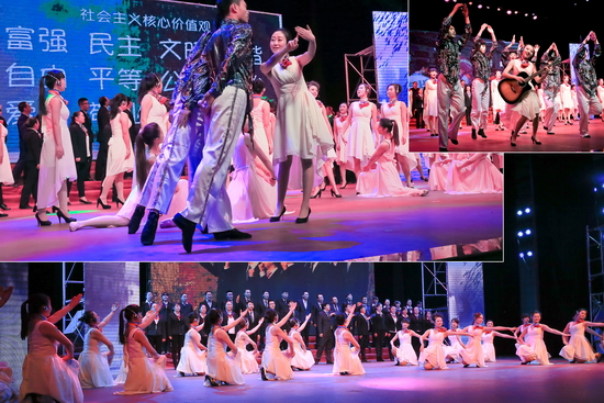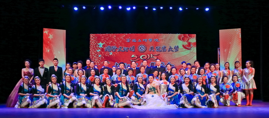 晚会在舞蹈《踏歌起舞迎新年》欢快、靓丽的的场面中开场,文理人跃马扬鞭辞旧岁,三阳开泰笑迎春!文理人创业发展共聚首,申硕飞跃喜盈门!音诗画《有一种思念叫雨》气势宏大,感人至深。舞蹈《Happiness》、《幸福像花儿一样》、《舞韵瑜伽》,小合唱《咱们工人有力量》、《青春圆舞曲》,歌伴舞《光阴的故事》、《苍天般的阿拉善》,戏曲大联唱《秦韵颂年华》,琵琶新民乐《欢沁》以不同的表演形式给观众带来了优美的视觉享受,既潇洒自如、活力四射,又优雅柔美、脉脉含情,让我们感受到文理人就像一个和谐的大家庭,幸福在辛勤的工作中,幸福在闪光的智慧里,幸福在共筑宝大梦的实践中。开元领导和首届全体研究生用诗朗诵《放飞强校的梦想》,让大家再次回忆了开元硕士授权与研究生办学的艰辛历程,文理人携手并肩,开疆拓土,挑战的是“共筑宝大梦”的伟大实践!全体辅导员用表演唱《辅导员之歌》表演了辅导员这支年轻队伍的学习、工作、生活,他们把微笑留在脸上,把责任担在肩上,为实现宝大梦辛勤耕耘。歌舞表演《洗衣歌新唱》表达了军民鱼水情,团结一家人的深厚感情。诗朗诵《青春畅想》表达了文理人的期盼和梦想。宝文理经历了凤凰的涅磐,挺起了坚强的脊梁,宝文理将《启航》2015,超越了发展的梦想。晚会在《共筑中国梦》庞大的表演阵容中圆满落下帷幕。晚会结束后,学校党政领导与演职人员合影留念。