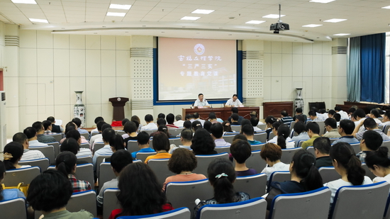 5月25日下午,校党委书记白黎在新校区木铎厅为全校处级干部及各党支部书记讲授“三严三实”专题教育党课。校党委副书记李全武主持会议。