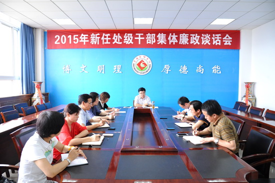 6月23日下午,校纪委在新校区图书馆806会议室召开了2015年新任处级干部集体廉政谈话会。校党委副书记、纪委书记米晓东同志、6名新任处级干部出席会议,谈话会由纪委副书记唐晓育主持。