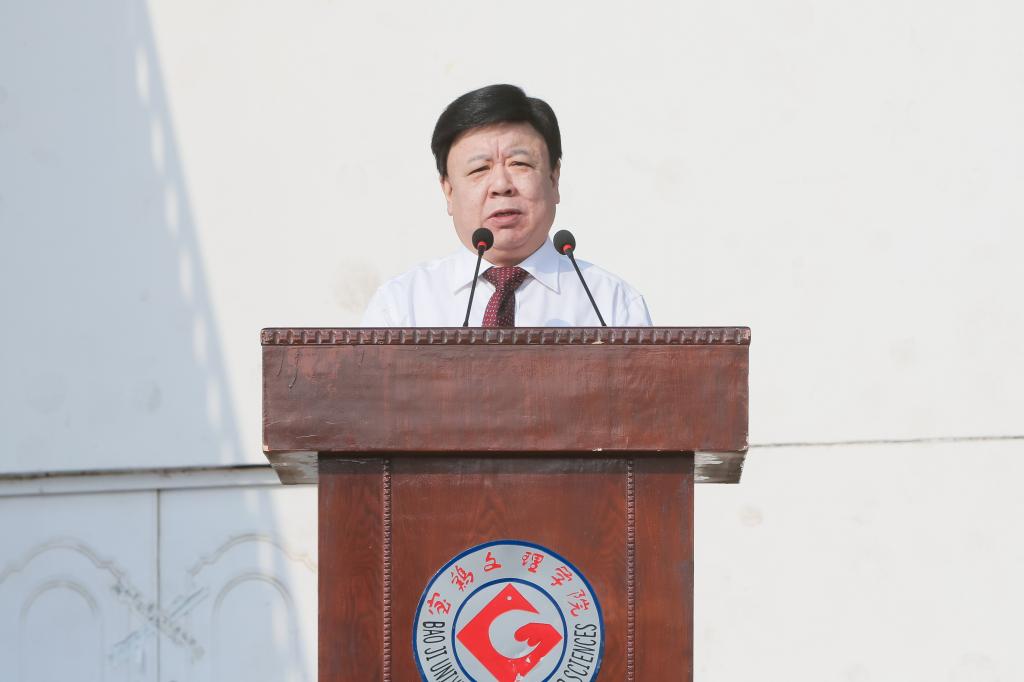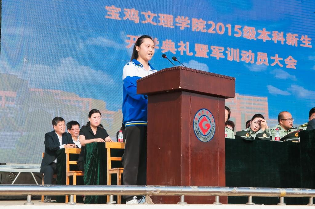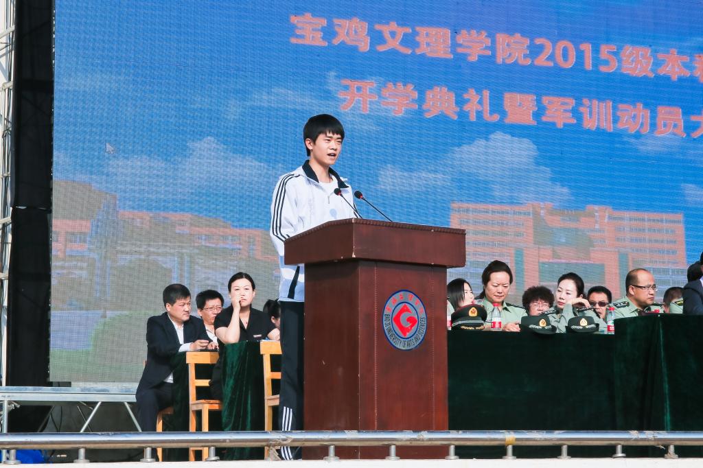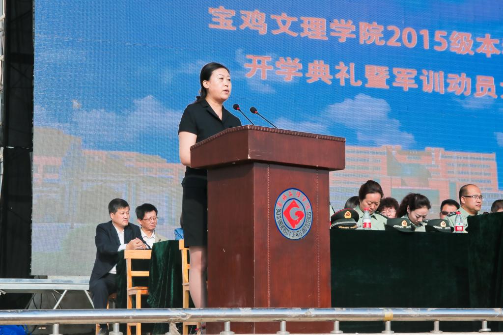 司晓宏在讲话中代表学校党委和行政以及全校师生员工向来自全国31个省、市、自治区的4983名新同学表示热烈的欢迎和诚挚的祝贺!向承担开元大学生军训任务的96401部队官兵们表示崇高的敬意和衷心的感谢!他向新生介绍了宝鸡的历史文化底蕴和现代化建设过程中取得的殊荣;介绍了学校的历史、专业、师资、就业等基本情况以及学校近年来抢抓机遇、走内涵式发展道路所取得的成绩;号召全校上下同心同德、锐意进取,朝着建设教学研究型的高水平宝鸡大学的宏伟目标奋进。他希望2015级新生勤奋学习、刻苦攻读;修德砥品、健全人格;强身健体、全面发展;志存高远,勇于担当。最后,他勉励同学们要正确认识军训的意义与价值,以饱满的姿态认真投入到军训活动之中,发扬不怕苦、不怕累的精神,磨练意志,砥砺品格,努力习获解放军的优良作风,圆满完成大学生活的第一课。