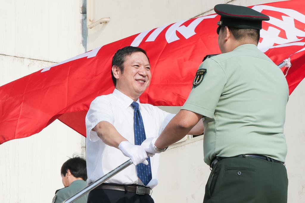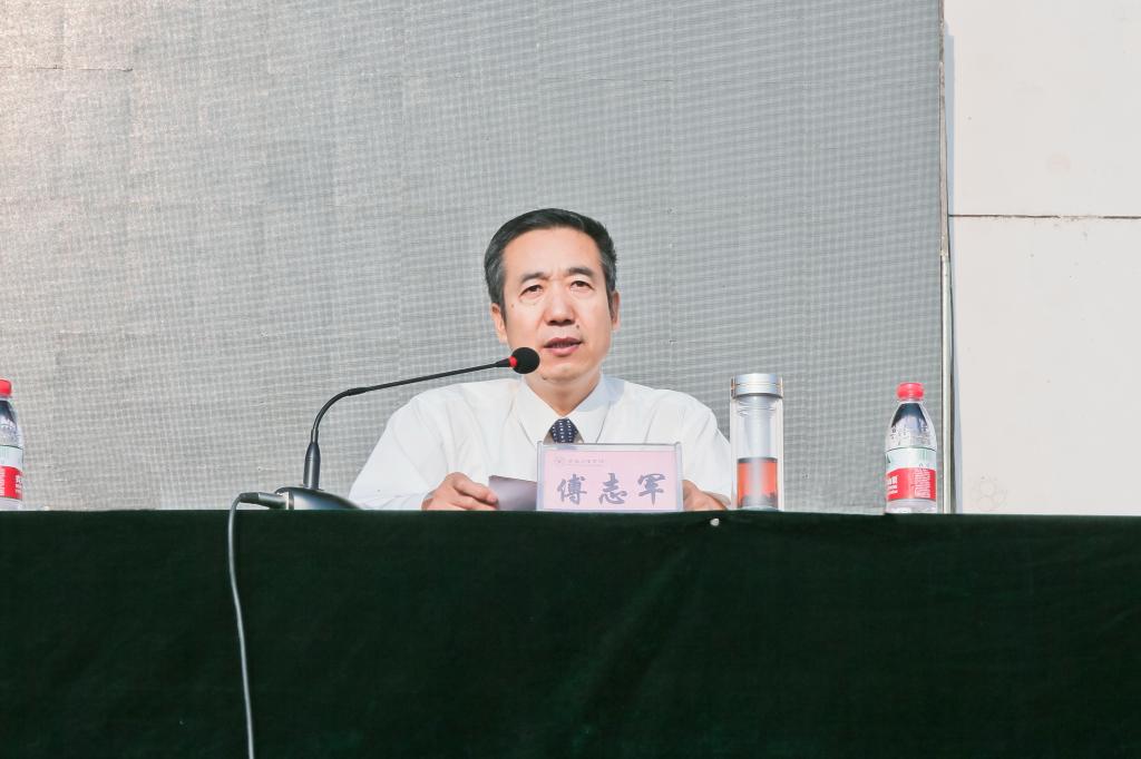 9月14日上午,开元2015级本科新生开学典礼暨军训动员大会在新校区体育场隆重举行。校党政领导白黎、司晓宏、米晓东、李全武、傅志军、赵荣侠,中国人民解放军96401部队王小兵中校等出席大会并在主席台就坐。校党委书记白黎为军训团授旗,校长司晓宏作重要讲话。副校长傅志军主持大会。