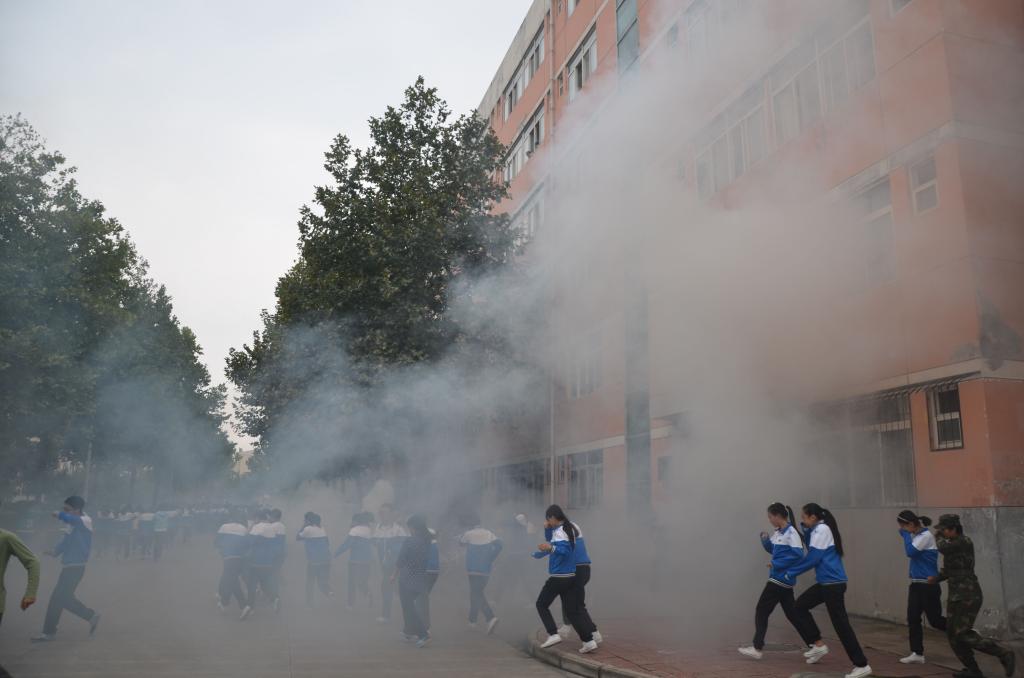 逃生疏散演练开始后,橘红色的浓烟弥漫了整个学生宿舍,在消防警报声响起后,楼内工作人员吹响口哨向同学们发出紧急撤离的指示,演练正式开始。同学们按照事先老师的要求用湿毛巾、袖口捂住口鼻,有组织地穿过层层烟雾撤离危险区域并在安全位置集合。在集合点,疏散人员根据军训连队划分集合整队,清点人数并报告教官,确保全体同学均已安全转移。