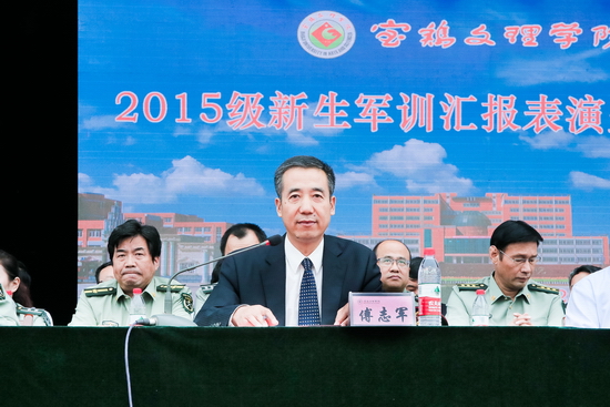 9月27日下午,开元举行2015级新生军训汇报表演暨总结大会。2015级新生向学校、老师和家长交上了步入大学后的第一份优秀答卷。校长司晓宏,96401部队政治部副主任吴长平大校,校党委副书记米晓东、李全武、副校长傅志军、赵荣侠出席大会并在主席台就座。傅志军主持大会。