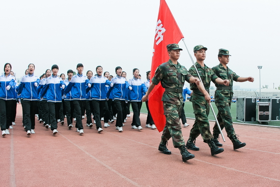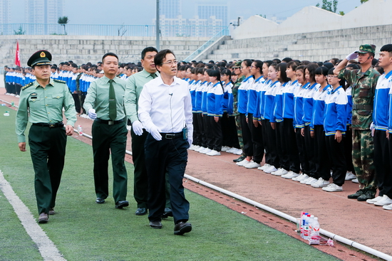 司晓宏在军训团团长王小兵、武装部长樊林森的陪同下,检阅了全体受训学生。随着雄壮的解放军进行曲响起,由各院系组成的24个方队列队经过主席台,同学们精神饱满、步伐整齐、口号响亮,激起阵阵掌声。