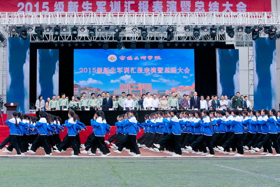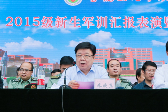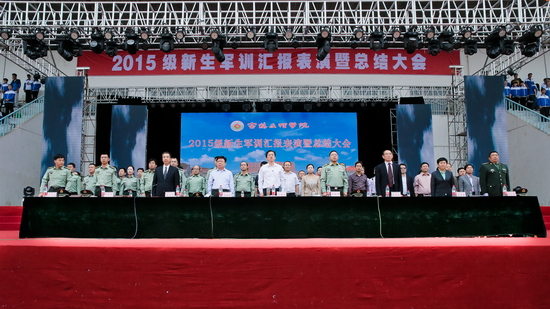 各院系党政主要领导、各职能部门主要负责人以及2015级参加军训的4613名新生参加了大会。(武装部 郑运平/文 张平/图)