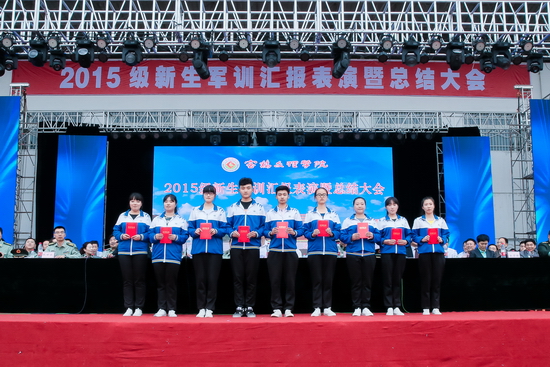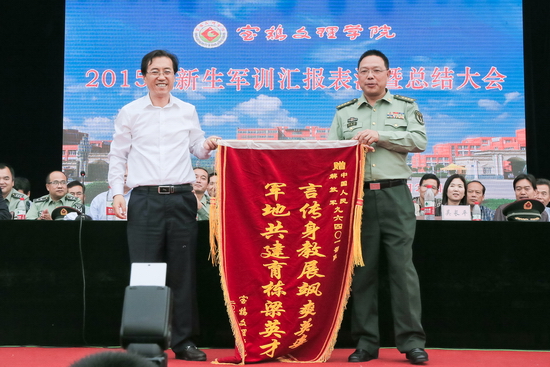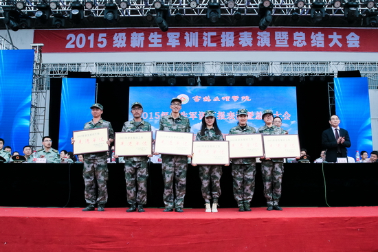 汇报表演结束后,司晓宏向96401部队赠送了锦旗。李全武宣读了军训领导小组《关于表彰军训工作先进单位和先进个人的决定》。校领导和部队首长为受表彰的单位和个人颁发了奖牌和证书。