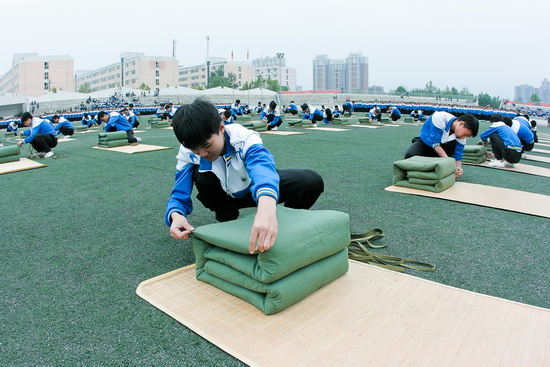 分列式结束后,分别由2015级新生组成的男子擒敌拳和女子军体拳方队进行了精彩表演,同学们以昂扬的斗志、整齐划一的动作、霹雳勇猛之势,赢得了师生的阵阵掌声。64名学生表演了整理内务、紧急集合和快速打背包科目,他们熟练的手法,紧张有序的动作,整齐好看的“豆腐块”被子和快速打背包给大家留下了深刻的印象,让同学们体验了部队生活的一角。