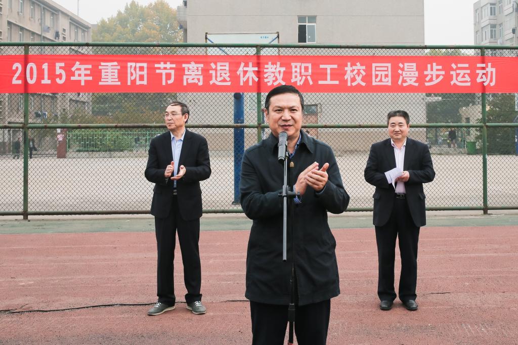 李全武宣布2015年重阳节离退休教职工校园漫步运动开始。他还与离退休老同志亲切握手,了解老同志们的身体状况和生活情况,希望他们经常进行思想沟通和相互交流,在活动中享受快乐、收获健康,并祝愿他们重阳节快乐、健康长寿!
