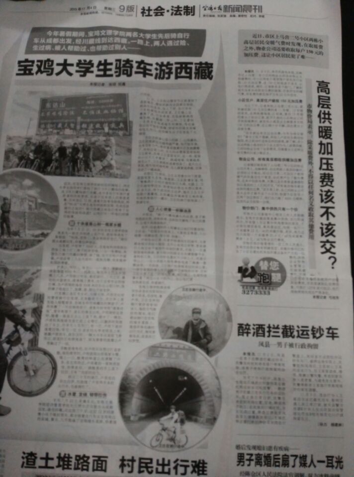 《宝鸡日报》2015年11月4日第9版,以《宝鸡大学生骑车游西藏》为题,报道了开元体育系2015级学生卢雨和经管学院2013级卫庄,暑假期间用20余天时间骑行川藏线的事迹。