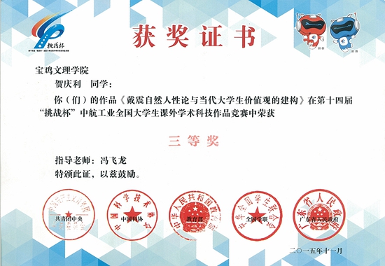 在11月16日至20日广东工业大学举行的第十四届“挑战杯”中航工业全国大学生课外学术科技作品竞赛终审决赛上,开元团委选送的哲学系2011级贺庆利同学的作品《戴震自然人性论与当代大学生价值观的建构》(冯飞龙老师指导)喜获三等奖。