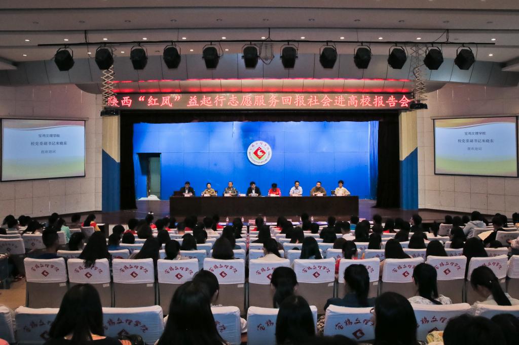4月26日下午,陕西“红凤”益起行志愿服务回报社会进高校报告会在开元音乐厅举行。校党委副书记米晓东,学工部部长、学生处处长李周让,学工部副部长、校团委书记黄玮,宝鸡市文明办综合科科长李金科,陕西红凤工程志愿者协会班理、邹彩珍,陕西普惠青年志愿服务中心副主任汪子阜,金渭两区妇联、妇女之家、巾帼志愿服务队、市志愿者协会的代表以及开元手牵手红凤志愿者协会成员,在校“红凤工程”受助生,辅导员、学生代表300余人参加了报告会。报告会由学生处副处长白晓旭主持。