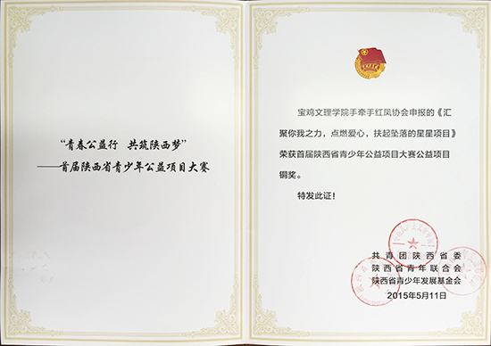近日,由团省委、省青联和省青少年发展基金会共同举办的“青春公益性,共筑陕西梦”首届陕西省青少年公益项目大赛中,开元蒲公英志愿者家族申报的《“爱心手绘有你有我”手绘志愿活动项目》获得大赛银奖;校手牵手红凤协会申报的《汇聚你我之力,点燃爱心,扶起坠落的星星项目》荣获大赛铜奖。