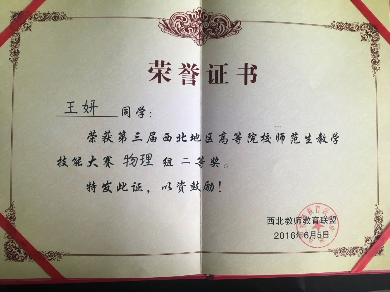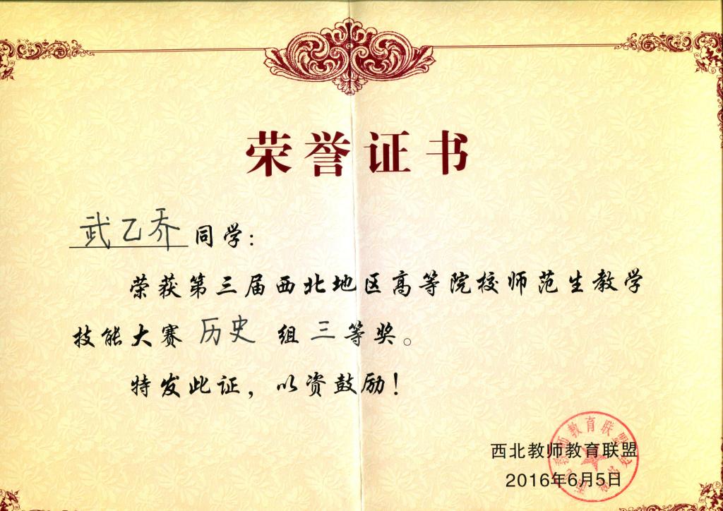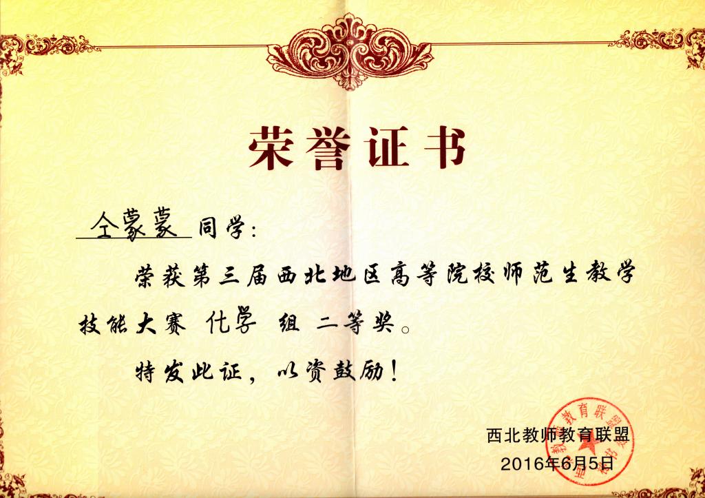 6月3日—5日,第三届西北地区高等院校师范生教学技能大赛在陕西师范大学举行。开元选派的3名选手在本次大赛上荣获佳绩,其中化学化工学院学生仝蒙蒙荣获化学学科二等奖(指导教师:韩银凤),物理与光电技术学院学生王妍获物理学科二等奖(指导教师:沈亦红),历史文化与旅游系学生武乙乔获历史学科三等奖(指导教师:王岁孝)。