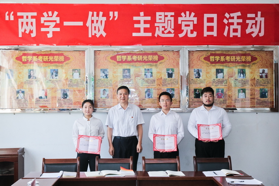 会上,吴婷汇报了学生党支部开展“两学一做”学习教育情况,并对下一阶段的学习教育工作进行了安排。哲学系党总支书记张全省宣读了《哲学系关于授予王逸飞、陈童、师肖肖“道德之星”荣誉称号的决定》。白黎为获奖同学颁奖并合影留念。王逸飞、陈童、师肖肖分别介绍了近日《宝鸡日报》等媒体报道的文理学子、哲学学子,爱心接力,为7107厂病重老人胡振尧老伴无偿捐献血小板的感人事迹。马传鑫、吴翠花、路兆兆、耿宏宏、史佳威、王蕊等六名学生党员和2015级学生班主任刘晓勇分别做了发言,对王逸飞等三位同学崇德向善、见义勇为的义举给予高度评价,并表示在开展“两学一做”学习教育之际,系上授予三位同学“道德之星”荣誉称号,让我们学有榜样,赶有目标,一定要见贤思齐,争做优秀党员。