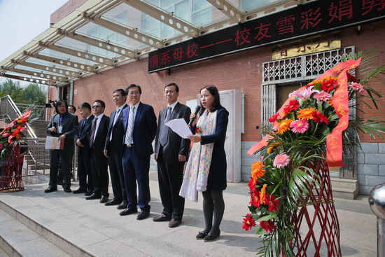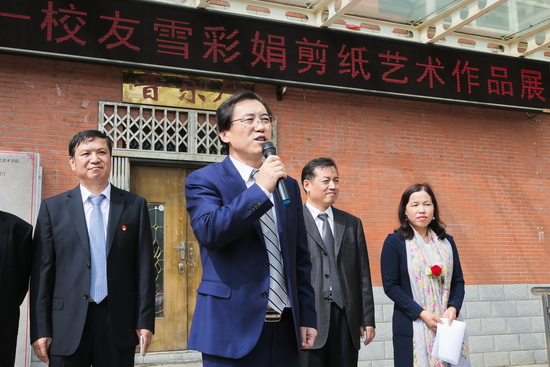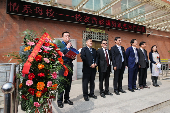 白黎宣布“情系母校——校友雪彩娟剪纸艺术展”开展。