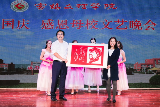 开元外语系88级校友雪彩娟现场表演剪纸技艺,剪出一副毛主席侧面头像和一首毛主席诗词,并将剪纸作品赠送给了母校,表达了校友对母校未来发展的美好祝福,也作为对祖国母亲67华诞的祝福;诗朗诵《真爱缱绻》赞扬了以陕西联兴房地产开发公司董事长徐洲成为代表的优秀校友为母校发展做出的积极贡献,激励着我们向榜样学习;歌曲《我爱你中国》、歌伴舞《好儿好女好江山》表达了文理学子对祖国母亲的真诚祝福与无限热爱;晚会在歌伴舞《梦想的旗帜》催人奋进的旋律中落下帷幕。