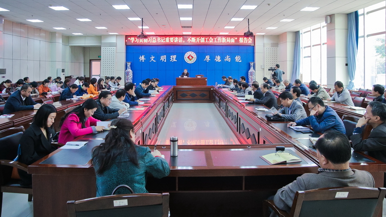 张敏以“学习贯彻习近平总书记重要讲话,不断开创工会工作新局面”为主题,从“四个全面”的战略部署,“五大发展理念”和“四种意识”为出发点,围绕学习习近平总书记“4.26”讲话精神和《中共中央关于加强和改进党的群团工作的意见》要求,指出工会工作必须始终坚持党的领导,坚持政治性、先进性和群众性,要围绕学校中心工作,在建设知识型、创新型高素质教职工队伍上下功夫,要在组织和发动教职工围绕中心工作、服务中心工作上下功夫,要在重视关心维护教职工合法权益上下功夫,要不断创新工会工作的方式方法,发挥好工会的职能,坚持和完善教代会制度,不断开创工会工作新局面。