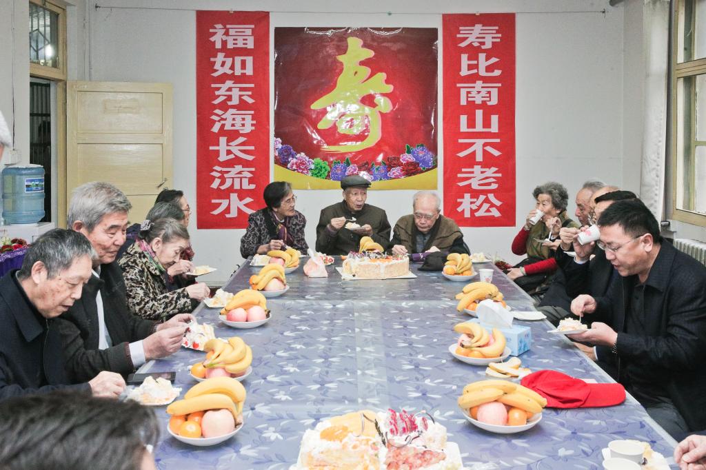 司晓宏和杨子元为老寿星赠送了贺礼和鲜花,老寿星一起吹灭蜡烛许下美好愿望,品尝生日蛋糕。