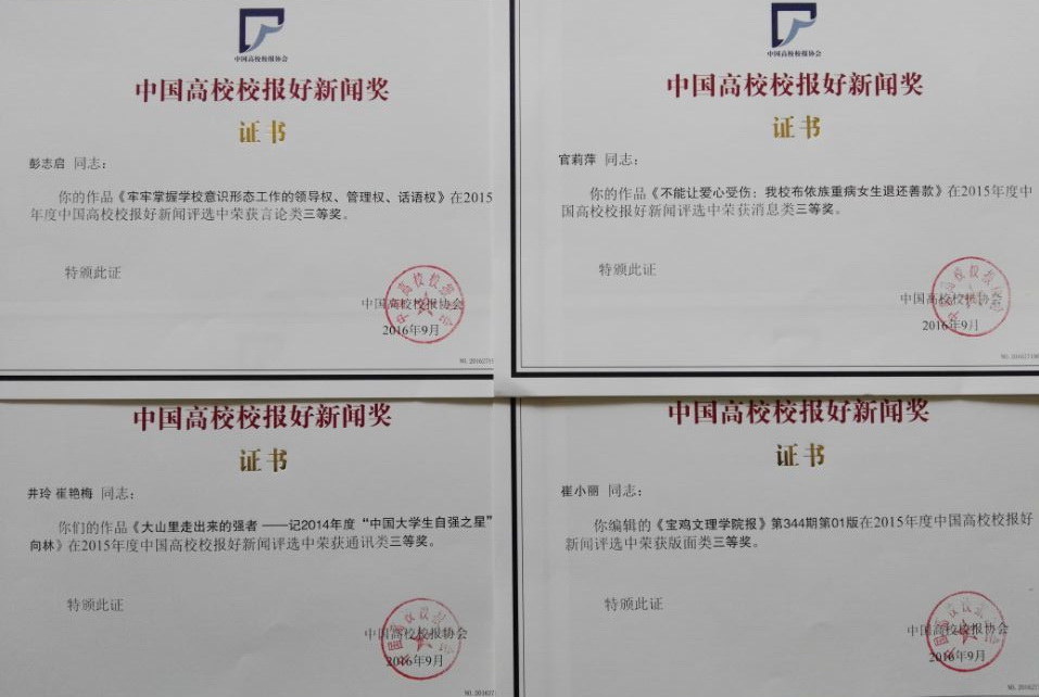 在2015年度中国高校校报好新闻评选中,开元校报编辑部选送的5件作品中有4件获奖。其中,彭志启采写的《牢牢掌握学校意识形态工作的领导权、管理权、话语权》获言论类三等奖,官莉萍采写的《不能让爱心受伤:开元布依族重病女生退还善款》获消息类三等奖,学生记者井玲、崔艳梅采写的《大山里走出来的强者——记2014年度“中国大学生自强之星”向林》获通讯类三等奖,崔小丽设计编排的第344期第1版获版面类三等奖。(党委宣传部 文/崔小丽 图/张选朝)