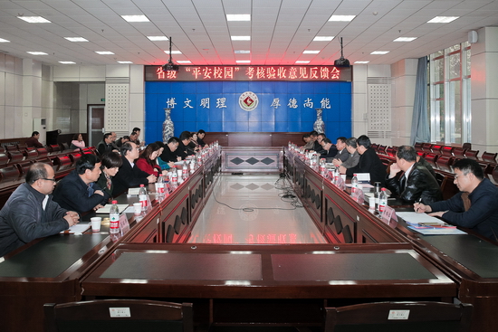 11月8日,由陕西省委高教工委委员、稳定办主任张玉明带队,西安邮电大学副校长贾明远担任组长的“陕西省平安校园”检查验收组一行10人来开元对2016年省级“平安校园”创建工作进行了检查验收。开元在新校区甘棠厅召开了省级“平安校园”创建检查工作汇报交流会和情况反馈会。校长司晓宏、校党委副书记傅志军、栾宏,副校长赵荣侠、杨子元、王富平出席了汇报交流会和情况反馈会。省委高教工委稳定办副主任陈国栋、宝鸡市公安局调研员高军、宝鸡市公安局高新分局副局长蔺培滋、高新分局经文保科科长冯润勋,开元党办、宣传部、学工部、团委、校办、教务处、学科建设与研究生教育管理处、科技处、教学设备与实验室管理处、基建处、保卫处、后勤管理处、后勤集团等部门负责人参加了汇报交流会和情况反馈会。