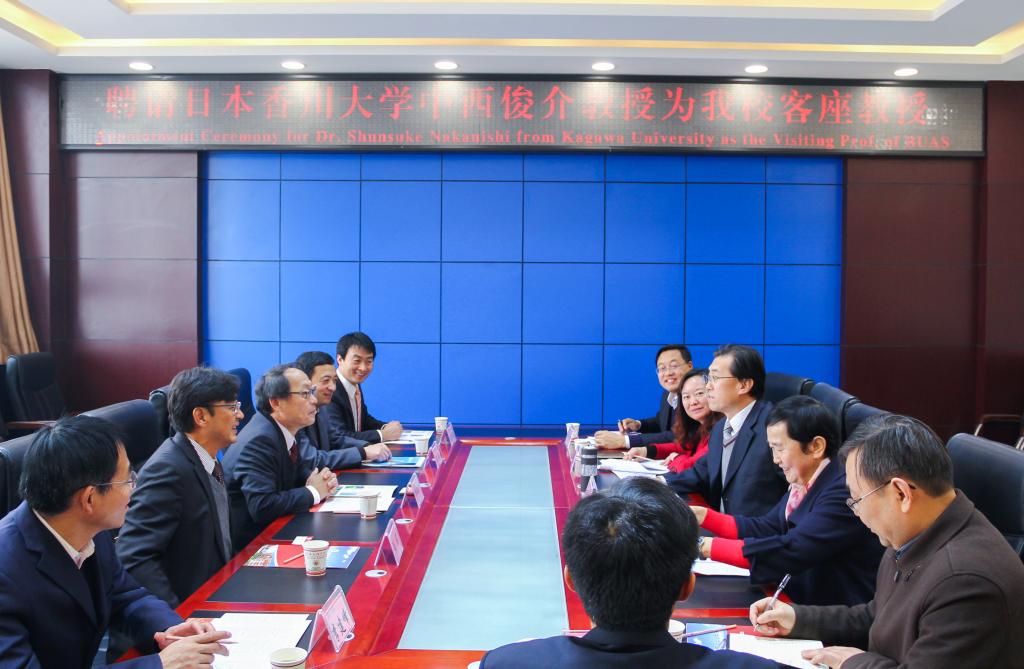 学校在图书馆806会议室举行了聘请仪式,司晓宏出席并为中西俊介颁发了聘书,仪式由赵荣侠主持。司晓宏代表学校21000名师生对中西俊介教授的来访及受聘为开元客座教授表示欢迎。他介绍了开元近60年的发展成就,未来发展规划,及建设高水平大学宝鸡大学等方面的情况。他指出,开放办学,积极寻求与国外大学合作是学校重要工作之一,学校支持化学化工学院与日本香川大学学工部开展务实合作,推动双方在其他领域实质性的合作。中西俊介对学校的邀请表示感谢,对受聘为客座教授深感荣幸。他向与会人员介绍了香川大学的发展历史,并指出,香川大学与开元有着深厚的历史渊源,此次受聘为开元客座教授,开展深入交流与合作,不仅是一种新的学习方式,也是教育同行加深了解,互通有无的一种途径,愿意为学校的发展做出贡献。