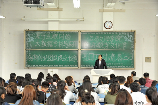 5月22日下午,由数学与信息科学学院主办的“基于互联网的大数据分析与应用”创新创业团队成立仪式暨第二届数学文化节开幕式在新校区思贤楼420举行。副校长杨子元出席会议并讲话。数学与信息科学学院副书记郝满义主持大会并宣布第二届数学文化节开幕。