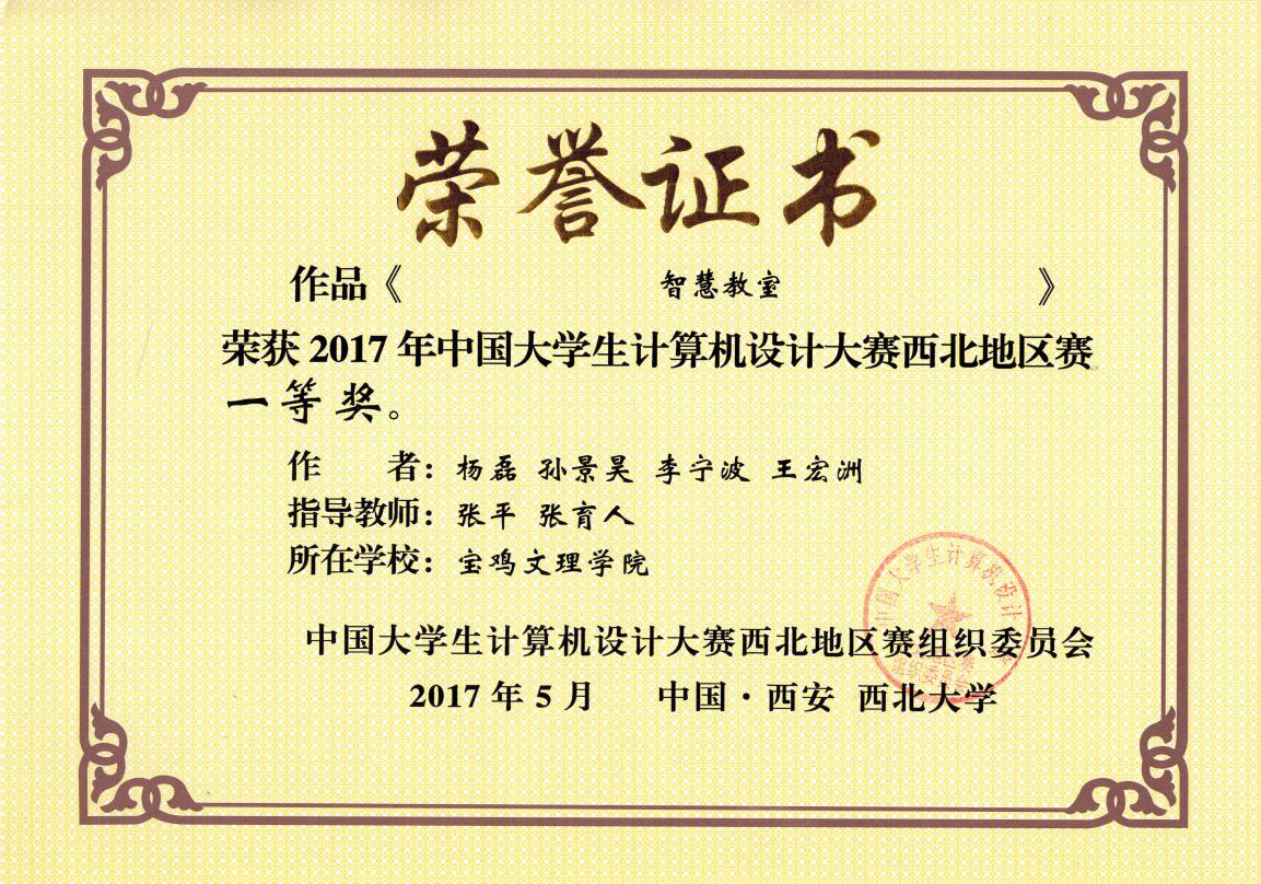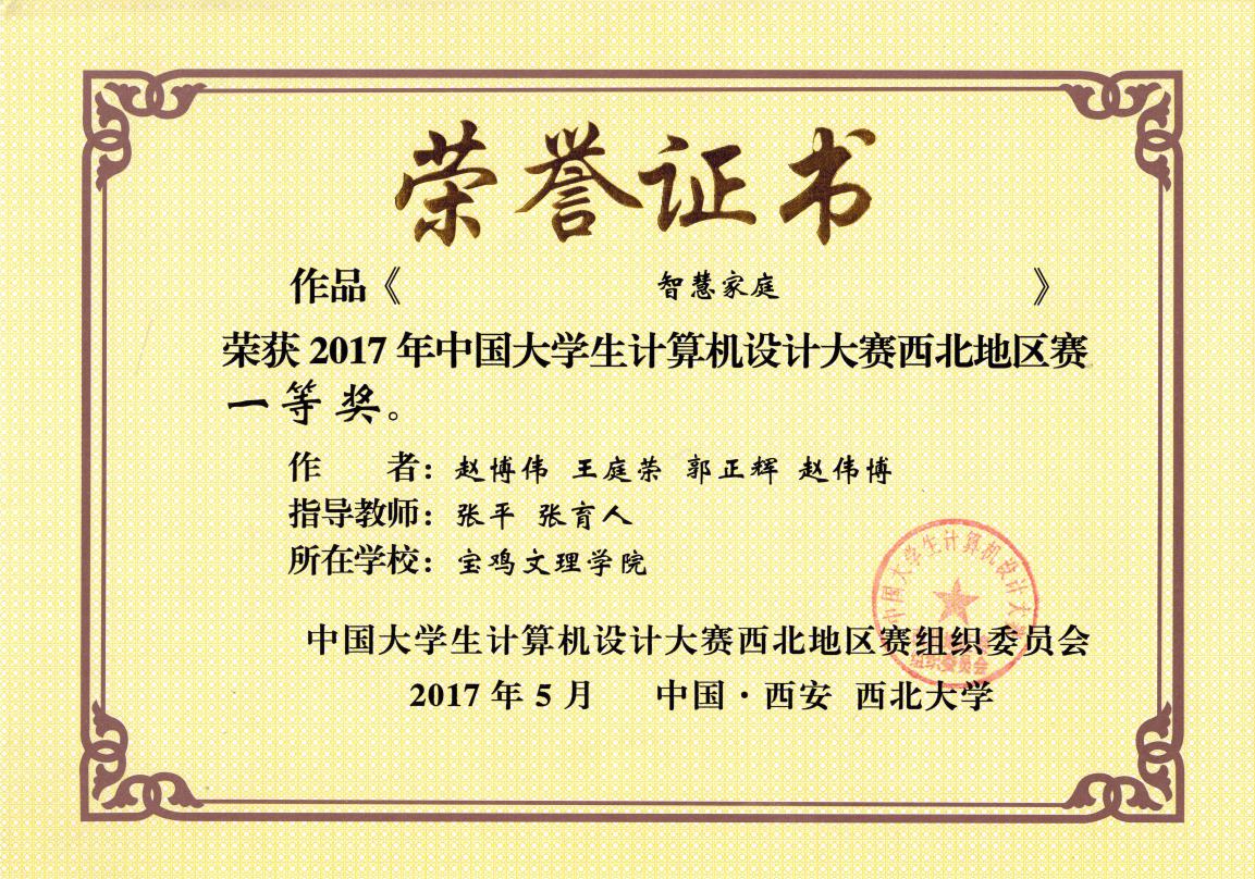 5月12、13日,由教育部计算机类专业教指委、软件工程专业教指委、大学计算机课程教指委主办,西北大学承办的2017年中国大学生计算机设计大赛西北地区赛决赛在西北大学落下帷幕。经过线上预赛,分赛区决赛等环节,由张平和张育人老师指导,计算机学院学生赵博伟、王庭荣、郭正辉、赵伟博设计的“智慧家庭”、计算机学院学生杨磊、李宁波、王宏洲设计的“智慧教室”两项作品,经过两天时间,同西安交通大学、西安电子科技大学、西北工业大学、西北大学、兰州大学等高校的559支参赛队的激烈角逐,最终同时以西北赛区一等奖的好成绩脱颖而出,入围全国总决赛。