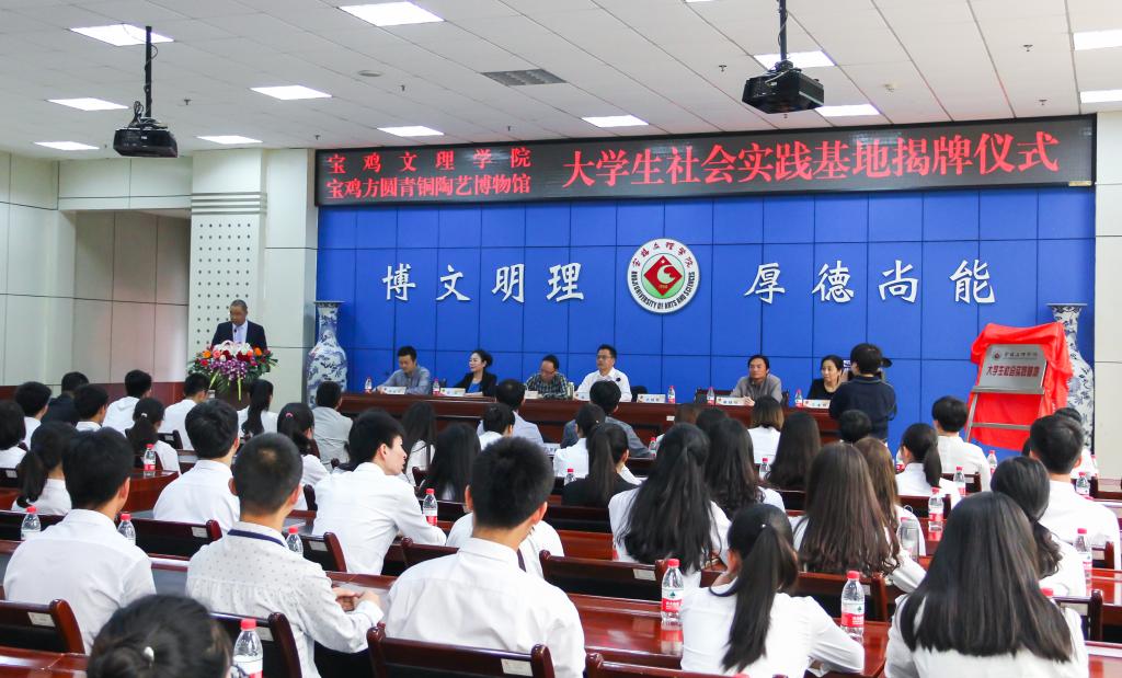 5月10日下午,学校在新校区甘棠厅举行宝鸡方圆青铜陶艺博物馆大学生社会实践基地揭牌仪式。校党委副书记栾宏,宝鸡方圆青铜陶艺博物馆馆长李晓敏,宣传部部长彭志启,经济管理学院党总支书记郝晓炜、副书记王永琪,学工部副部长、团委书记黄玮及各院系团总支书记、青马班学员、各院系学生代表150余人参加了揭牌仪式。仪式由创大办副主任田富平主持。