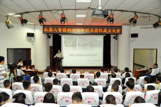 6月9日下午,机械工程学院机器人智能制造创新创业团队成立大会在老校区综合楼一号报告厅举行。校长司晓宏、副校长杨子元、秦川机床工具集团股份公司机器人减速器厂技术厂长杨刚、校办主任任宏亮、科技处处长田延峰、教务处副处长俱国鹏、电子电气工程学院吴宏岐教授、计算机学院刘鹏辉教授以及机械工程学院师生代表共计150余人出席了成立大会。会议由机械工程学院王参军教授主持。