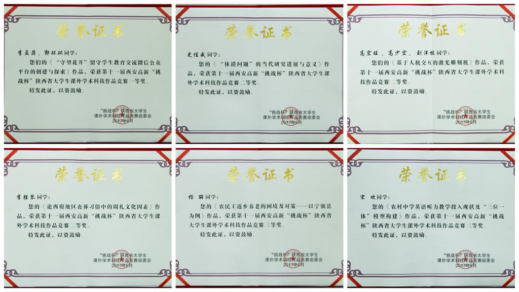 近日,在由共青团陕西省委、陕西省科技厅、陕西省教育厅、陕西省学联、西安高新区管委会、陕西省科学院、陕西省社会科学院共同主办、西安邮电大学承办的第十一届西安高新“挑战杯”陕西省大学生课外学术科技作品竞赛中,开元选送的教育学院李孟菲、郭环环同学的作品《“守望花开”留守学生教育交流微信公众平台的创建与探索》荣获一等奖;电气学院高宏旺、高少宏、刘洋栋同学的作品《基于人际交互的激光雕刻机》,历史系李胜琴同学的作品《论西府地区丧葬习俗中的周礼文化因素》,哲学系史佳威同学的作品《“休谟问题”的当代研究进展与意义》荣获二等奖;哲学系杨丽同学的作品《农民工返乡养老的困境及对策——以宁强县为例》,外语系宋欢同学的作品《农村中学英语听力教学投入现状及“三位一体”模型构建》荣获三等奖。(校团委 文、图/张磊)