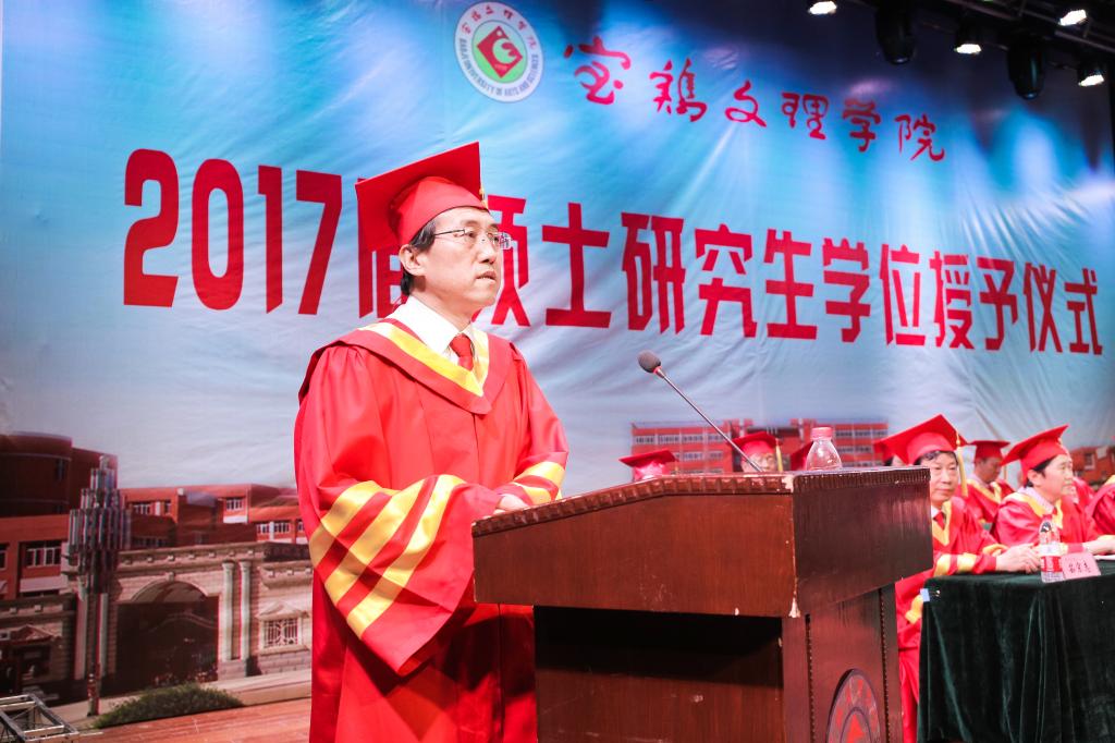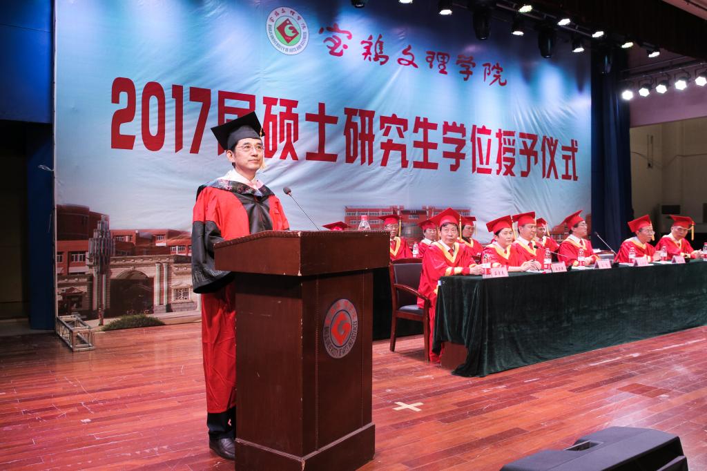 文学与新闻传播学院赵德利教授代表全体导师对圆满完成学业的2017届硕士研究生表示衷心祝贺,希望毕业生在步入社会之际要以自己是宝文理的一员而感到骄傲和自豪。2017届硕士研究生、地理与环境学院潘蓉同学代表全体毕业生向辛勤培育他们的学校领导和老师表示最衷心的感谢和最崇高的敬意,并祝愿母校早日实现建成宝鸡大学的宏伟目标!