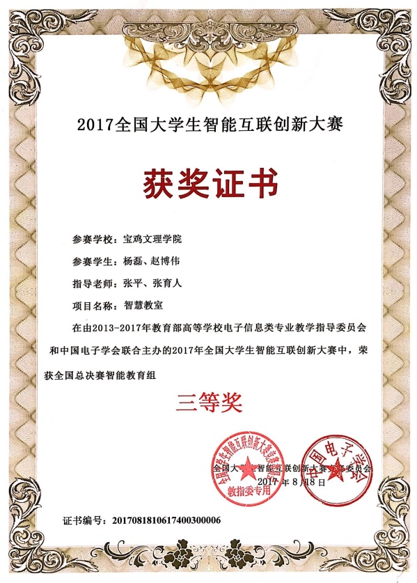 8月15日至19日,由教育部高等学校电子信息类教学指导委员会和中国电子学会联合主办的2017年全国大学生智能互联创新大赛全国总决赛在重庆邮电大学落下帷幕。经过线上预赛,分赛区决赛等环节,由开元计算机学院张平和张育人老师指导、计算机学院赵博伟、贺伟伟、薛斌设计的“基于残障儿童的家庭监护系统”作品荣获华西赛区二等奖。由张平和张育人老师指导,计算机学院杨磊、赵博伟、韩重津设计的“智慧教室”作品经过与华西、华中、华南、华北四个赛区近千支队伍的激烈角逐,最终以华西赛区一等奖的好成绩入围全国总决赛,并夺得全国总决赛三等奖的佳绩。