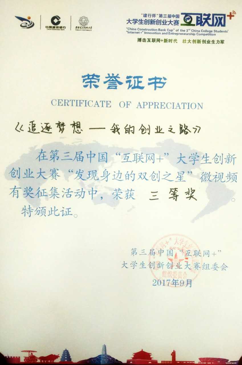 中国“互联网+”大学生创新创业大赛“发现身边的创业之星”活动以短视频形式,真实记录大学生的创新创业故事,展示了当代青年大学生创新精神和创业热情。大赛共有753个团队或个人报名,提交作品543部。经网络投票和专家评审,共产生了16项等级奖,陕西高校获奖2项。开元数字媒体影像制作与传播大学生创新创业团队选送了5部参赛作品,最终孟改正副教授指导、刘超创作的《追逐梦想——我的创业之路》获得三等奖。