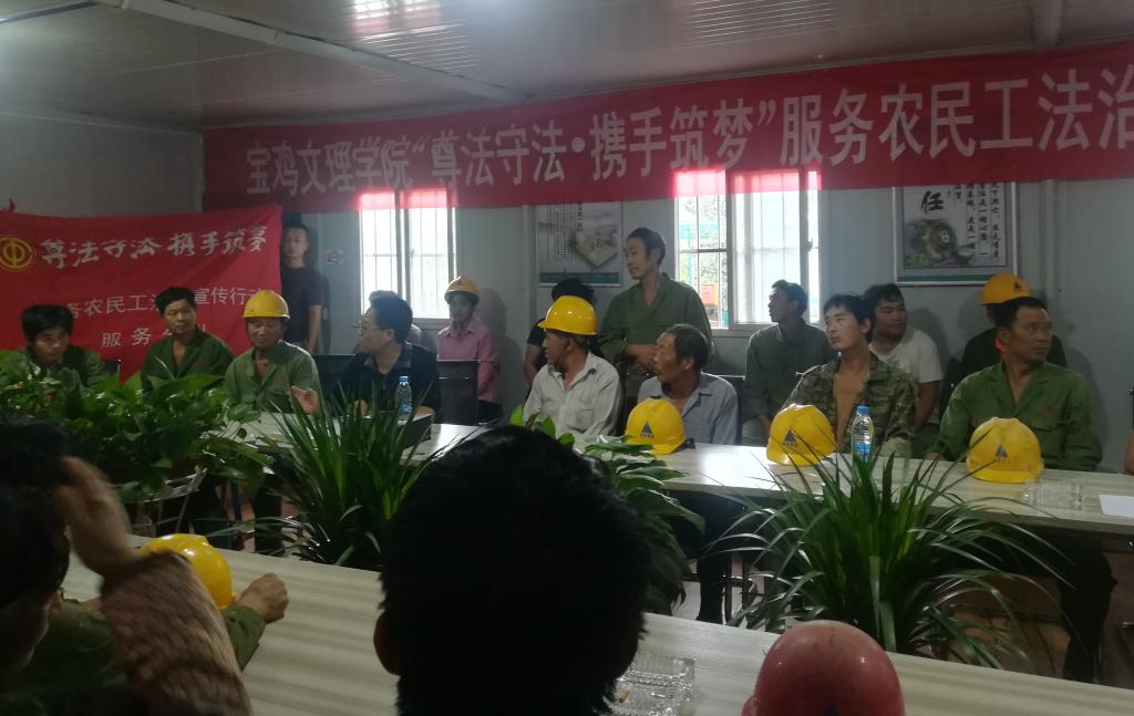 为充分发挥高校服务社会职能,按照陕西省总工会和省委高教工委的安排部署,9月21日下午,在宝鸡市总工会的大力支持和校工会的组织下,开元“尊法守法·携手筑梦”服务农民工法治宣传服务分队走进宝鸡建安集团第十一项目部建设工地,为农民工开展法治宣讲活动。