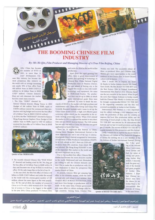 百忙之中,何钦先生还在约旦最大的报纸《宪章报》上撰写关于中国电影的文章“TheBooming Chinese Film Industry”(快速发展的中国电影),详细介绍了自入关以来中国电影产业的发展,文章在当地引起了很好的反响。