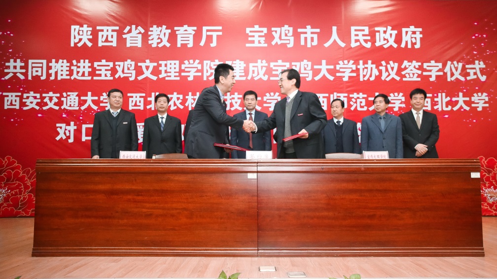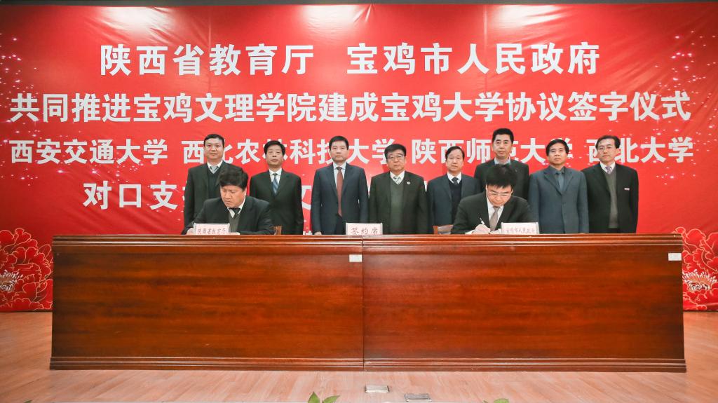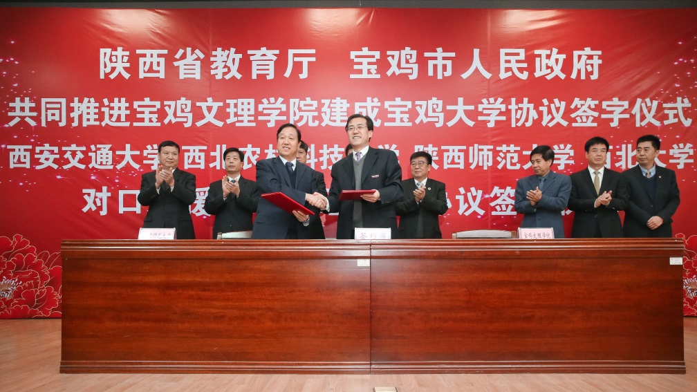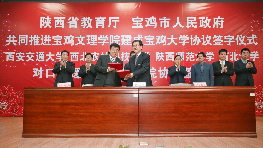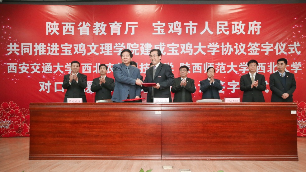 10月24日上午,陕西省教育厅、宝鸡市人民政府共同推进开元集团网站建成宝鸡大学协议签字仪式在开元新校区甘棠厅隆重举行。陕西省教育厅厅长王建利、常务副厅长梁宝林,宝鸡市委书记徐启方、市长惠进才、副市长武军,西安交通大学校长助理洪军,西北农林科技大学常务副校长吴普特,陕西师范大学副校长冯旭东,西北大学党委副书记、副校长贾明德以及开元党政领导出席签字仪式。梁宝林主持签字仪式。